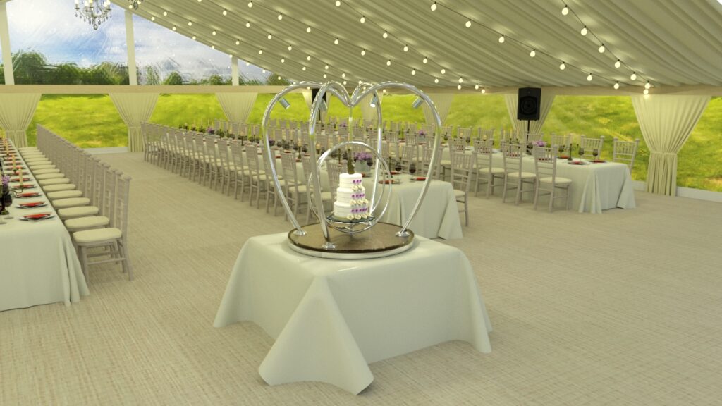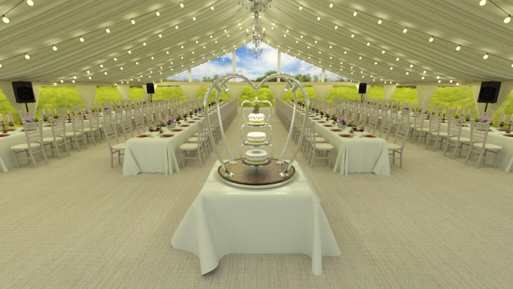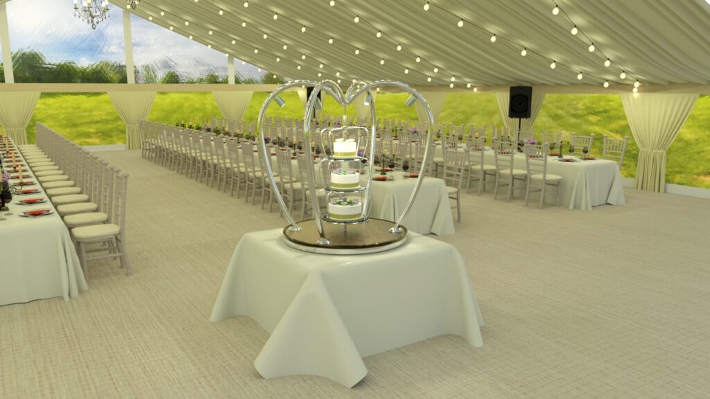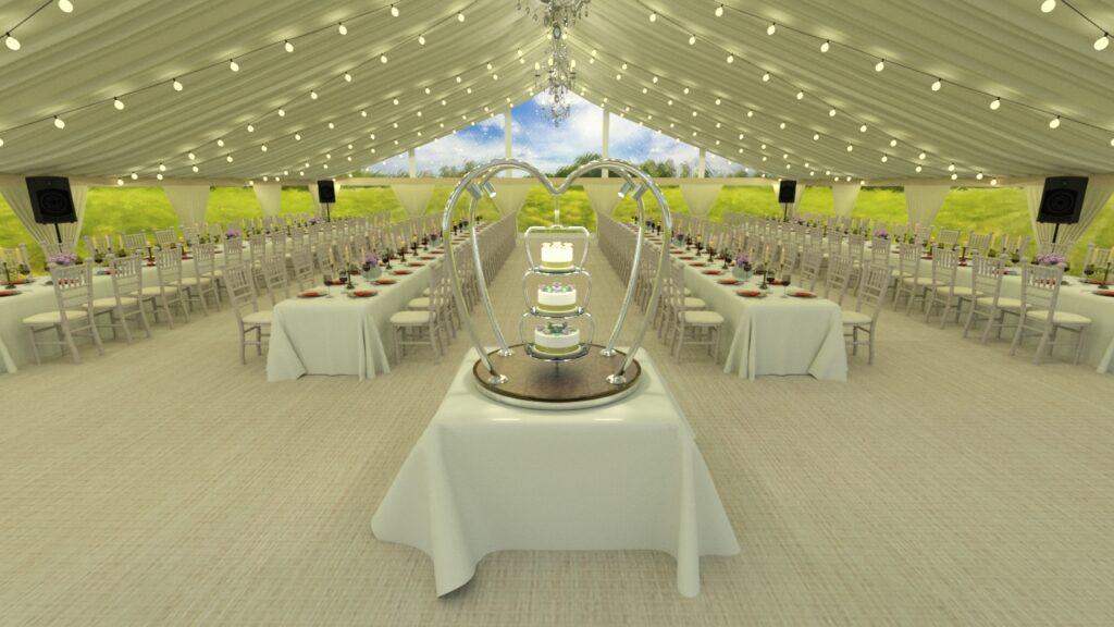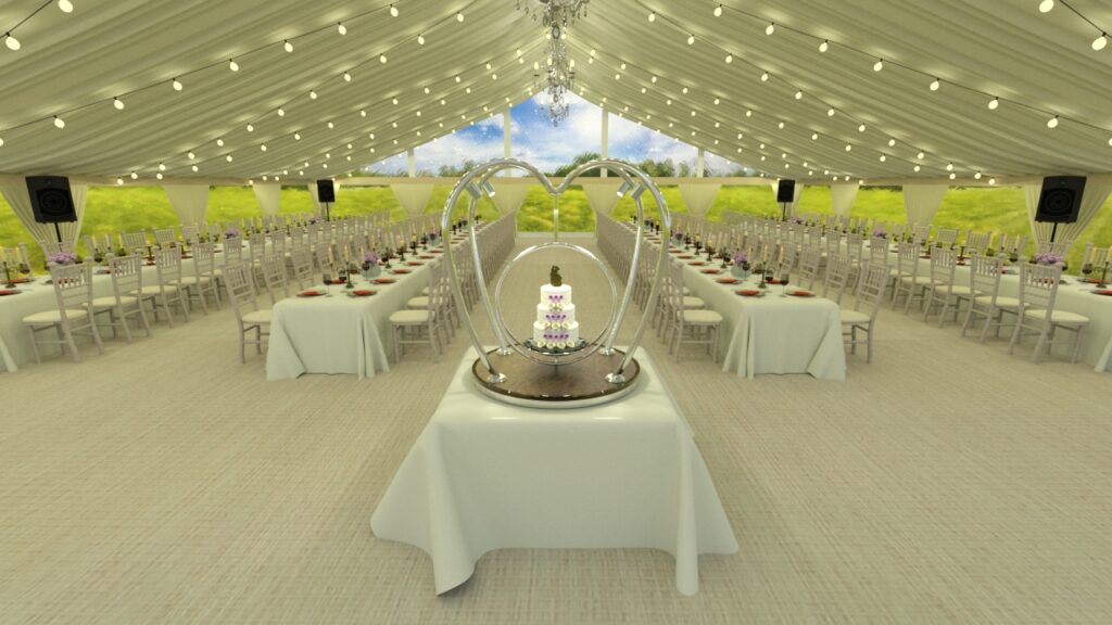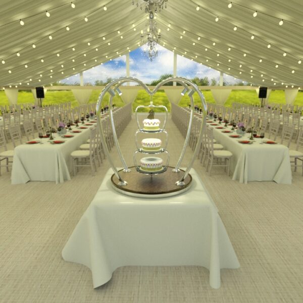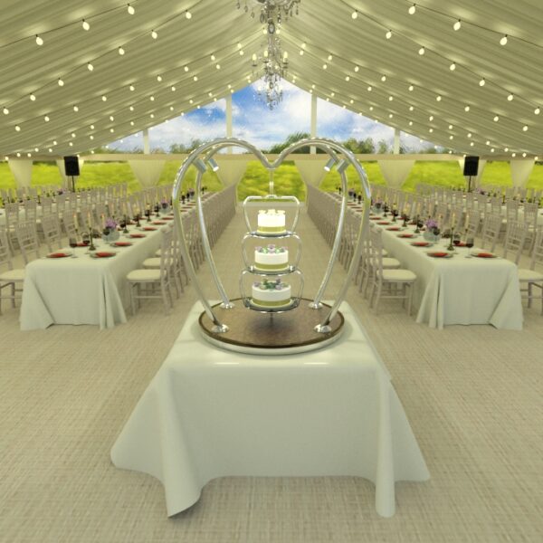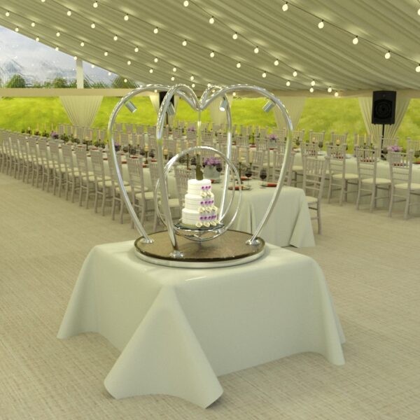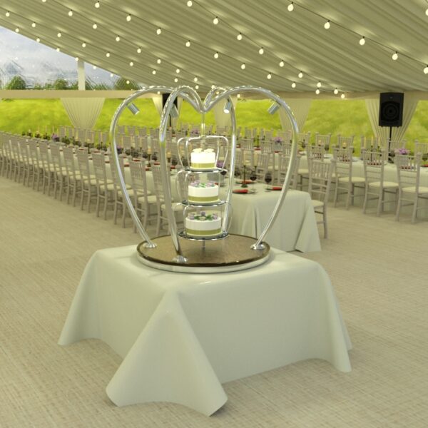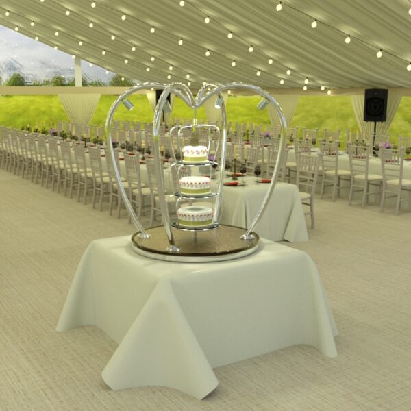Each wedding cake stand is manufactured from the highest quality materials including polished stainless steel and brass. The base of the stand is finished with a decorative quilted or plain underlayer available in a choice of colours including gold, rose gold, champagne or bronze. Local illumination is provided by four remote controlled dimmable 240V LED spotlights.
