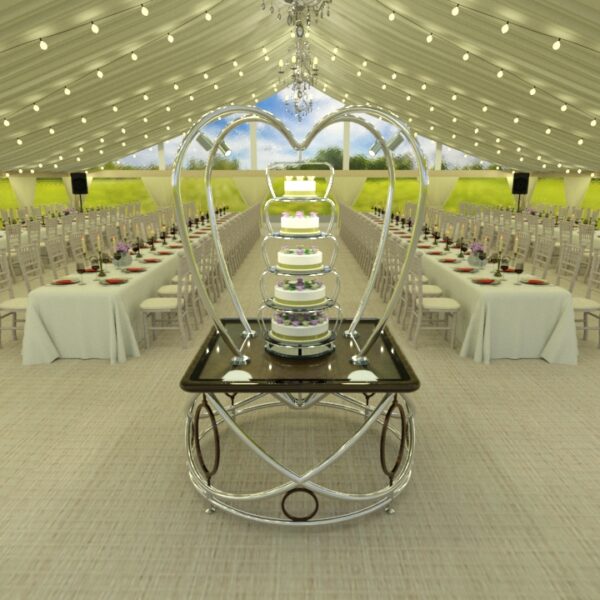 The PADS 5 tier luxury wedding cake display table serves upto 295 portions and is available in 2 different display style variations.