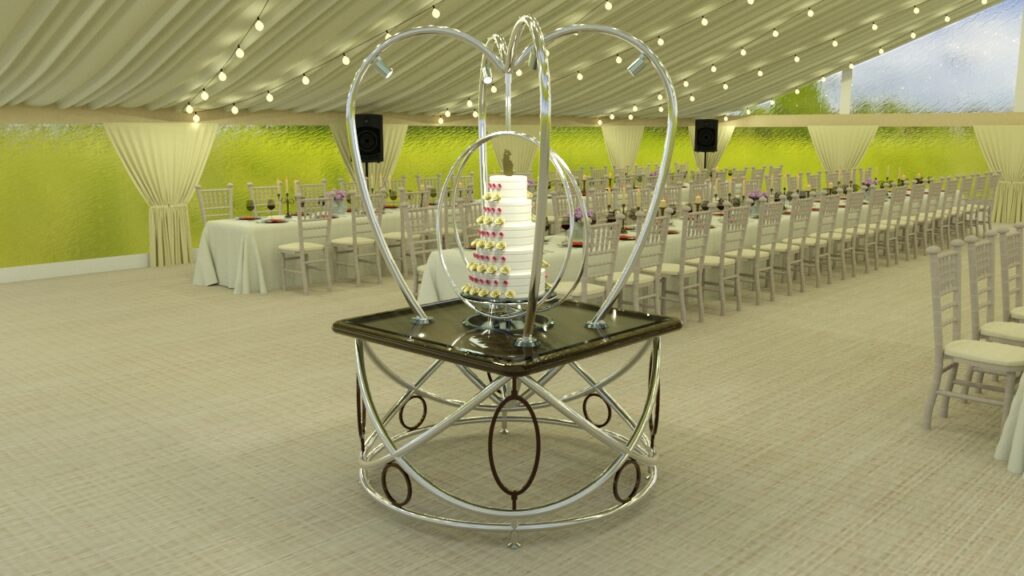 Each wedding cake table is manufactured from the highest quality materials including polished stainless steel and brass. The glazed table top is equipped with a decorative quilted or plain underlayer available in a choice of colours including gold, rose gold, champagne or bronze. Local illumination is provided by four remote controlled dimmable 240V LED spotlights.