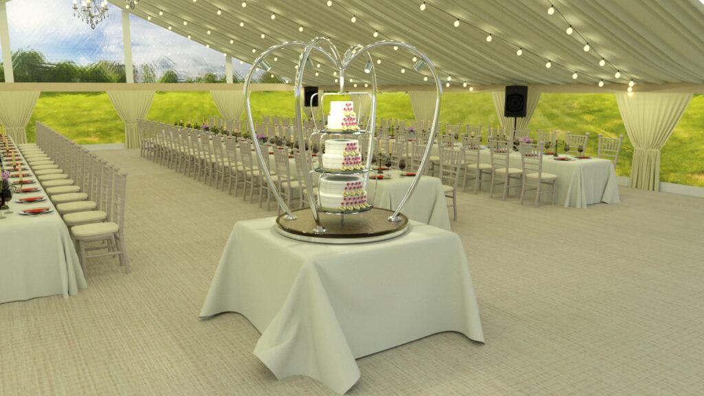 Each wedding cake stand is manufactured from the highest quality materials including polished stainless steel and brass. The base of the stand is finished with a decorative quilted or plain underlayer available in a choice of colours including gold, rose gold, champagne or bronze. Local illumination is provided by four remote controlled dimmable 240V LED spotlights.