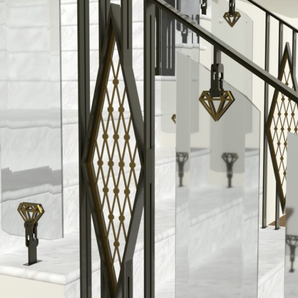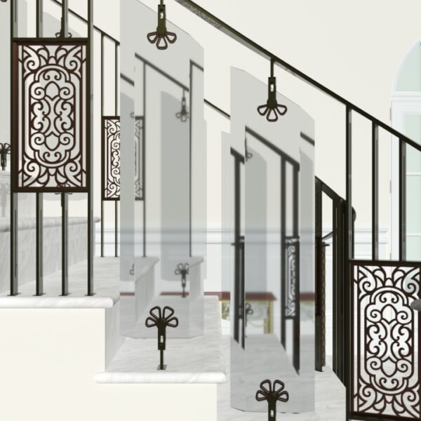 Petal Insignia glazing clamps used together with Art Nouveau grille panels.